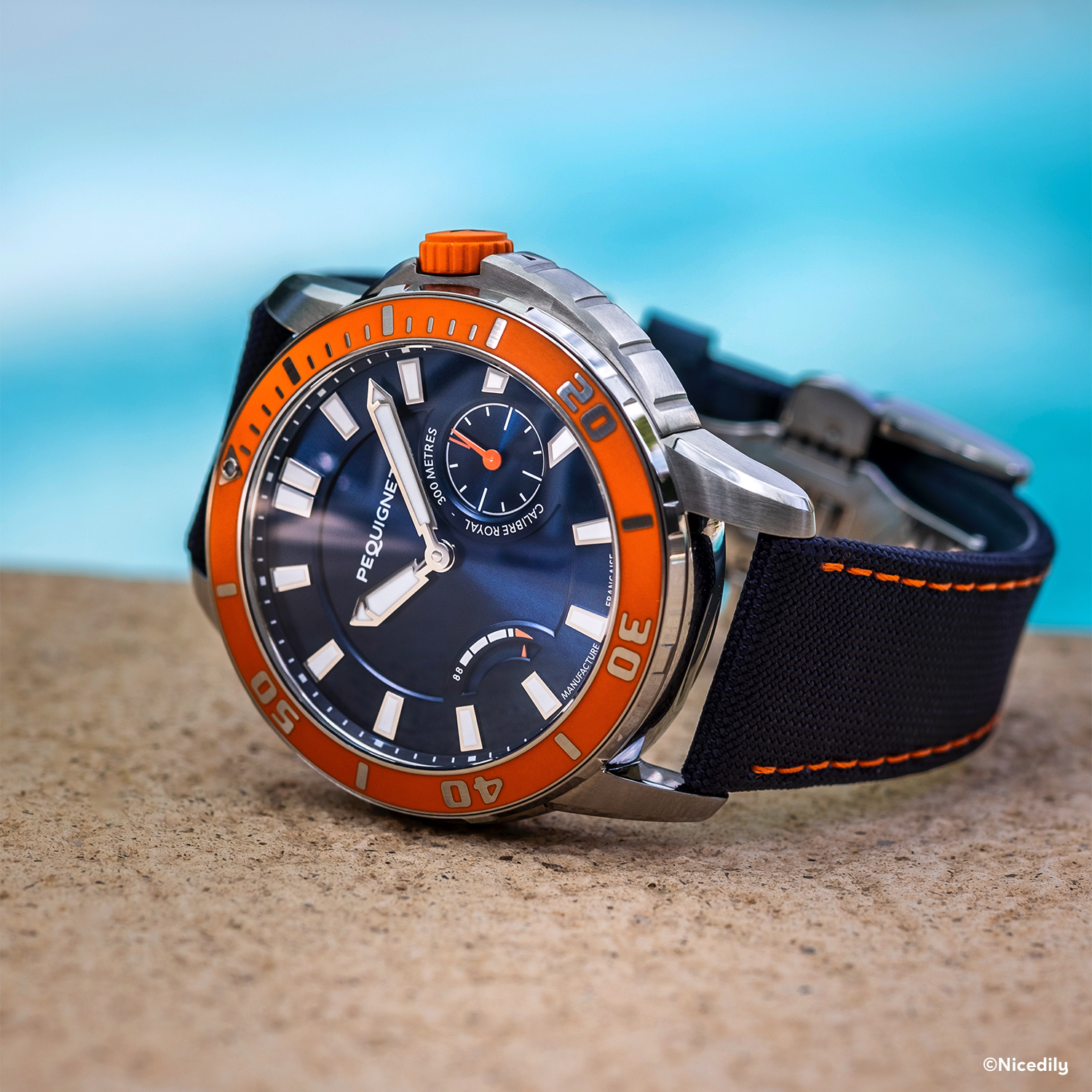 The Extrême 300 watch by Stef' is personalised with an intense sunray blue dial and a blue cordura strap with orange stitching. This special edition is limited to 30 pieces and is exclusively sold at Bijouterie Clouzeau located in Phitiviers (France).