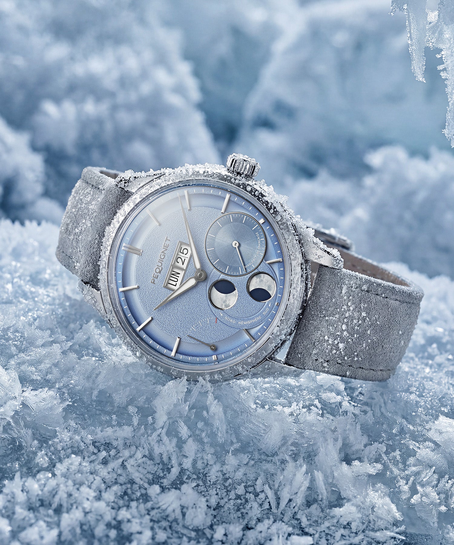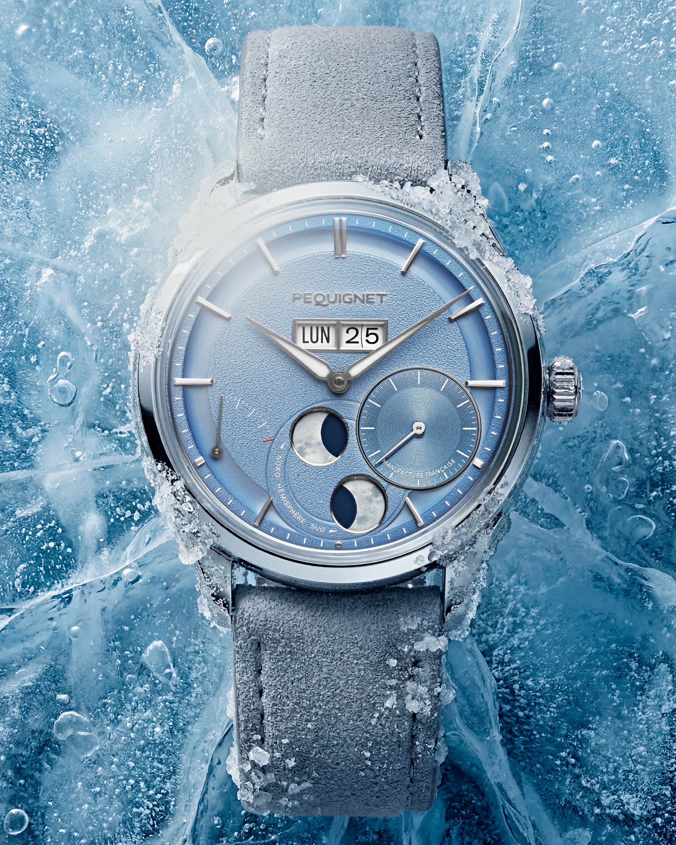 The icy blue color enhances the dial’s texture: it highlights the grained surface, the sandblasted grooves, and the fluted small seconds at 3:30. It further elevates the various complications of the Royale Paris: the large date, the power reserve, and the moon phase. The latter is displayed across two apertures, providing a realistic view of the Northern and Southern hemispheres.