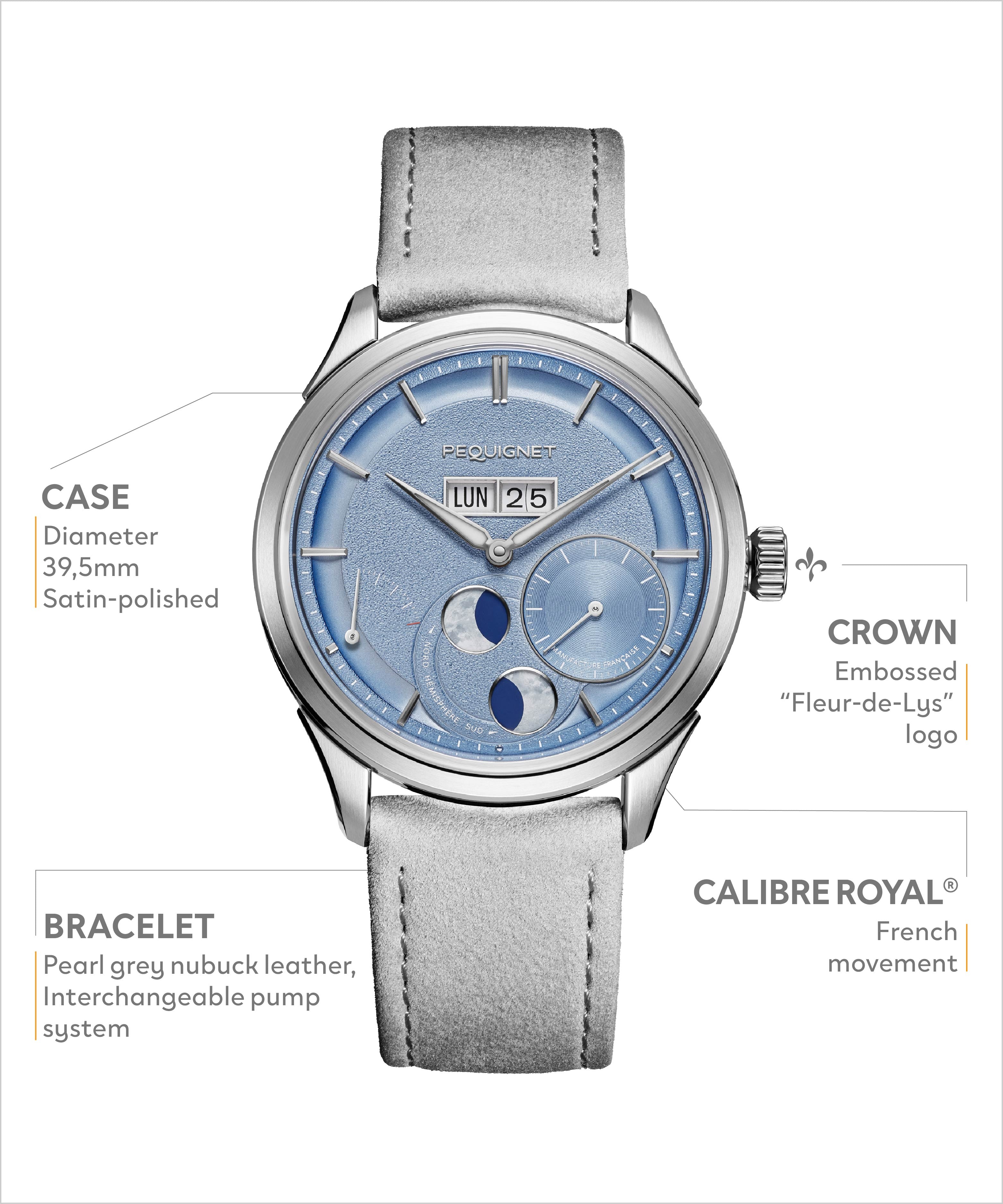 Like all Royale Paris watches, this new model is powered by the prestigious Calibre Royal®, PEQUIGNET’s first in-house movement. It integrates all its horological complications on a single plate and offers a 96-hour power reserve.